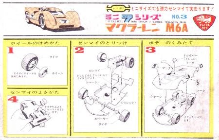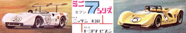 キットのキャラメルボックス側面に印刷されているミニセブンシリーズのラインナップです。No.1は「ニッサンR381」そしてNo.2は「トヨタセブン」で、No.3が今回紹介した「マクラーレンM6A」となります。 |