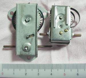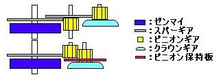 ここでちょっと細かい話になりますが、このゼンマイモーターを知る人は真上から見たこの写真だけでどこにどんなギアが使われていたかを思い出す事が出きるでしょう。一般的なレイアウトである左側のゼンマイを例に取ると、上から順にいくと、まずゼンマイの直接のアウトプットである一番大きなスパーギア、次に空転装置として働く増速ギアがあり、3つ目は最終出力であるシャフトへ90度出力軸をオフセットしながら連結する為のクラウンギアを下向きにセッティングし、最後にタイヤを取りつける駆動シャフトが出ています。 高回転低トルクの電動モーターから駆動力を取るモーターライズキットのギア群が ≪減速ギアシステム≫ であるのに対して、低回転高トルクのゼンマイから駆動力を取るゼンマイモーターのギアは ≪増速ギアシステム≫ になっているのが常識です。それによって回転数を上げながら同時にトルクを落としてゼンマイのリリース時間を調整しているわけですね。 所で右側の「マクレラーレン」に付いている小型ゼンマイも一見略同型の同一機構に見えますが、実は空転ギアは増速ギア(小径のピニオンで受けて同軸大径のスパーで出力する)ではなくて、ゼンマイ軸の大スパーの力をその先のクラウンギア軸へ伝えるだけの単なるトランスファーの役目をしているに過ぎません。パワーの弱い小型ゼンマイでは3段の増速ギア比は不適切で増速2段で十分だったのでしょう。所がこの増速2段で空転装置を組み込む機構はこのままではちょっと厄介な事になります。下の図を見てください。 左の図の上は通常の100円キットのゼンマイシステム。下はこのミニセブンシリーズのゼンマイシステムです。中央にある空転用ピニオンギアに、径の大きいスパーが付いていないミニシリーズのゼンマイは、1個のピニオンの直径の両端で入力と出力のギアと連接しなければならない為にスパーによる逃げのクリアランスが取れず、空転用ギアのシャフトは出力側のクラウンギアと干渉してしまいます。そこでこのキットのゼンマイでは問題のシャフトをクラウンギアに達する前にカットし、その部分でシャフトの下端を保持する為のプレートを追加する必要がありました。上記の写真で車軸の付け根に見えるプレートがそれで、両側に突き出た2枚のツメで支えられています。このゼンマイシステムは非力な故に、スパーギアは1枚少ないものの、組み立てに要する手作業の工程は、逆に100円の汎用ゼンマイよりも多くなっているわけです。このジレンマは、後にクラウンギア自体に空転機能を持たせてギアの数を減らした次世代小型ゼンマイシステムが出現するまで続きました。 それにしてもメーカーにとってこのゼンマイシステムの原価は一体いくらだったのでしょうか。 |