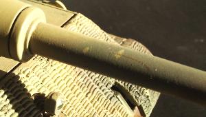 ![]() 同じく「ガチンコバトル」時に、互いの車体と砲身でがっぷり四つになった時に受けた砲身上の傷跡。食い付きの良いラッカー系塗料までこそがれる重量級バトルの激しさを、無言のうちに物語っている。 |