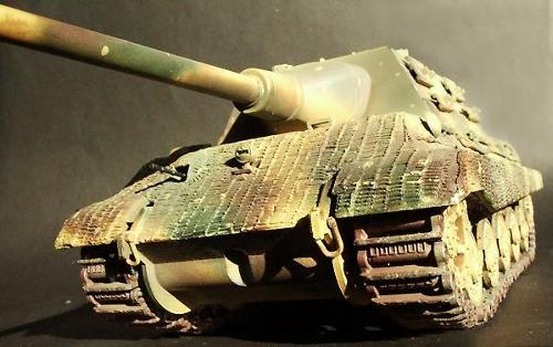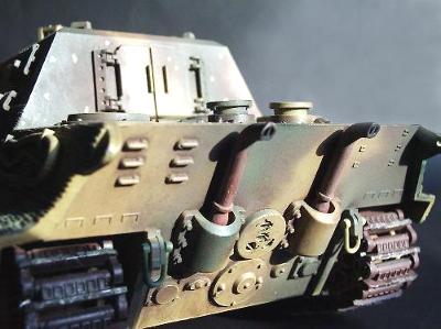 ![]() 重量間溢れるリアビュー。パンサー、タイガーII系のこの逆ハングしたメカニカルな後部は、造型的には非常に魅力的な部分である。 OVM類もキットオリジナルのパーツをそのまま使用しているが、ツィンメリットコーティング部分にかかる取り付け部品は、コーティング終了後あらためてピンバイスとマイクロドライバーで取り付け穴を空けて瞬着でがっちりと固定してある為、スコップ1本ですら脱落の心配は皆無である。 |