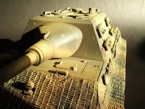 キット紹介1ページ目では主にモンスターマシンとしての側面を強調したが、20年数年ぶりに製作に着手したドイツ戦車という事で、オヤヂ博士はディスプレイ面での作業にも力を入れている。但し激烈なバトルを想定している為、戦闘室上面の釣り上げ用シャックルは本来の逆U字型に作り変えずにキットオリジナルの中抜けしていないプレート状のままである。また、姉妹キットの「キングタイガー」と共通になっている車体長の調整も行っていないなど、現在のディスプレイ派のディティールアップレベルまでは至っていない。しかし基本形状が素晴らしいこのキットは素組みでも充分にモデリングを楽しめる好キットである。 |