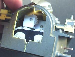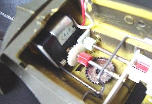 更に左モーターのすぐ上の壁面からランチャー基部シャフトが覗いているのが分るだろうか?前述したランチャー可動機構はこのモーターと壁面の僅か数ミリの空間で機能する事となる。 撮影時点は上のランチャー駆動説明の写真撮影時期とは前後しており、まだ内部結線は行われていない状態である。 | |
