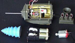 これにより「最後部のチューンドFA−130モーターによる最前部のドリル駆動」、「車体前部空間にセッティングされたマイクロモーターによる車体後部のミサイル仰角コントロール」というパワートレインの交差式レイアウトが誕生した。 余裕度の全く無い空間に展開するレイアウトとしては一見常識を外れた動力伝達デザインであるが、この機械要素の空間占位設計によって初めて、超絶4CH魔改造が実現したのである。 | |