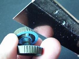 左はレザーソーでカットした様子。右はカット後ドーナッツ状に切り離されたホイール部分の内周にピッタリとフィットするように加工したプラ板をはめ込んで接着した所。この後製図用サークルテンプレートなどを使って正確にセンター出しをした後にプラ板に穴をあけ、再度ペアとなる各ホイールを接着して完成となる。 作業に着手するまで気の重かった博士であるが、いざ着手してみると結構サクサクと作業の進んだ工程であった。 これによりオリジナルでは単純なタル型ホイールであったものが機能強化され、走行時のキャタピラの脱落は皆無となった。ミドリのSF戦車を2CHリモコン化するにあたっては必須作業と言える。 |