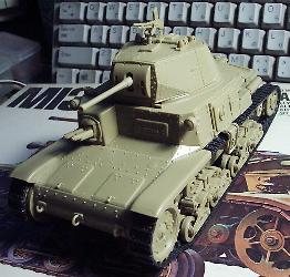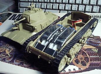 ![]() ![]() カーロアルマートの小さな車体に完璧にセッティング出来るギアボックスは、まるでこのキットの為に設計されたような絶妙なバランスです。タイトな車体前面装甲板と車軸の位置も、無改造でクリアできます。 さて、このキットのキャタピラの穴は1mm×1.5mm程度と非常に小さい一方、ドライブスプロケットの歯が大きい為、仮組状態でキャタピラを回した所「歯が穴に入る」「歯が穴から抜ける」という動作がスムーズにいきません。まずスプロケットの歯の山を半分程度にしてみましたが、まだダメそうです。 そこで次にキャタピラの穴そのものをキリでグリグリ広げてみましたが、それでも上手くいかないので、業を煮やして「ままよ!」とばかりリモコン走行させてみた所、歯と穴が噛み合わずにキャタピラが歯の上に浮いた状態で全く問題なく走りました。(^_^;) キャタピラの外れもありません。 このスケールでこのサイズのキャタピラですから、個人ユーザーで簡単にナントカ出来るものでも無さそうな為、ここは敢えてこのままで楽しむ事にしようと思います。 ちょっと見には気が付かないので、皆さん黙っていて下さいね。(^b^;)シーッ。 ギアボックスが小さいので車体内部にはまだ余裕があります。また砲塔下の戦闘室の張り出し部分には単四電池が4本入るスペースがあるので、タミヤのアクトパル用ラジコンユニットを移植できるかも? |