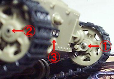 このキットを走行モデルにする為の最大のポイントは、アイドラーホイールの回転改造でしょう。まず車軸のモールドをそのまま残して、その中心部にピンバイスで1mm程度の穴を貫通させます。私は100円ショップで売っていた精密ドリルを使いました。そこに小物工作用の小さな真鍮クギを適当な長さに切って差し込みます。車軸が抜け無いようにクギの頭を利用する訳です。(矢印1) 同じように車輪側にも穴を開け、クギの先端を差し込み、飛び出した部分をヤスリで綺麗に整形します。(矢印2) 因みに矢印3はダイオード用ソケットを流用したリモコンコードのコネクタです。 |