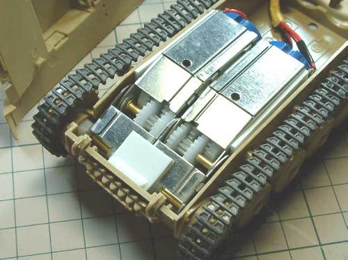 ![]() 車体は内側の出っ張りをすべて切り取ってしまいます。できるだけ平らにしておいた方がギヤボックスを固定しやすくなります。 まずはモーターをセットしない状態でギヤボックスの位置決め。両面テープなどで仮り止めしてから、固定用のネジ穴上部から3ミリドリルを差し込んで車体に穴を開けておきます。 ギヤボックスの折れ曲がりの位置を固定するために、プラバンやプラ棒で支えを追加。 転輪と誘導輪はキットのまま。起動輪は6角パーツと、ポリキャップ代わりの8歯のピニオンギヤ(スライスて短くしてます)で挟み、エポキシ接着剤で固定しました。 |