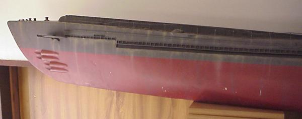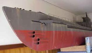 | けんたさんから届いた画像の2枚目はこれです。流麗な中にもマッシブな存在感を漂わす特型潜水艦艦首部分。バックに見える引き戸の鴨居部分との対比で、その巨大さが尋常ではない事がお判り頂けるでしょうか? | |