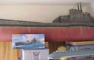 更にカメラは引いて、船体中央部分を写します。痒い所に手が届くように、けんたさんは比較写真としてピットロードの伊号の箱を一緒に写し込んで下さいました。 実はけんたさんによればこの特型潜水艦のスケールは1/40との事です。特型潜水艦と言えば全長122メートルですから、単純に計算すればこのモデルの全長は3メートルを僅かに超えるものとなり、ここから王国掲示板での広報担当の「3メートルの潜水艦!」発言に繋がったのですが、このモデルには大きな秘密がありました。それにしても手前のシービュー号や、その後ろの肌色のモノも気になります。これアンギラス? | |