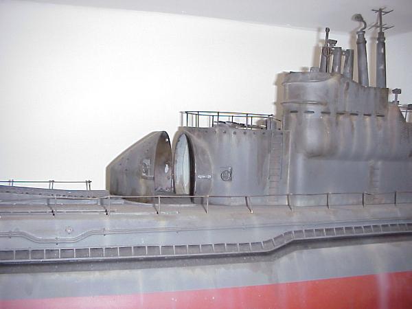 | 搭載機格納筒開口部と艦橋のアップ。流石に1/40ともなれば作り込みが凄いですね。広義の意味でこれも模型である事には間違いないのですが、1/40の特型潜水艦となると大量生産という形態は固より、市販品ですらありえず、これはもう一品モノの特別な発注品である事は間違いありません。しかしてその実態は…。 |