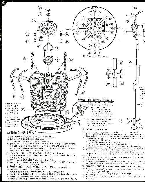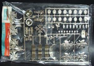 燦然と輝く黄金を模したメッキ部品の威容を御覧下さい。日本のプラスチックモデルの特徴あるカテゴリーの一つに、豪華さを強調した金メッキバージョンがあります。例えばお城のプラモデルでもランクが一つ上の「ゴールデン姫路城」なるものがそうですが、そういったプラモデルが装飾効果を狙ったオブジェ的表現であったのに比べて、このキットのメッキ表現は正真正銘の金をモデル化したキンキラキンの部品です。そう思うと、「ゴールデン○○」といったものが何か悪趣味な俗っぽさを感じてしまうのに比べて、このキットの輝きは将に正当な黄金の証しとでもいえるでしょう。 ああ、目がくらみそうじゃありませんか・・・・・。 | |